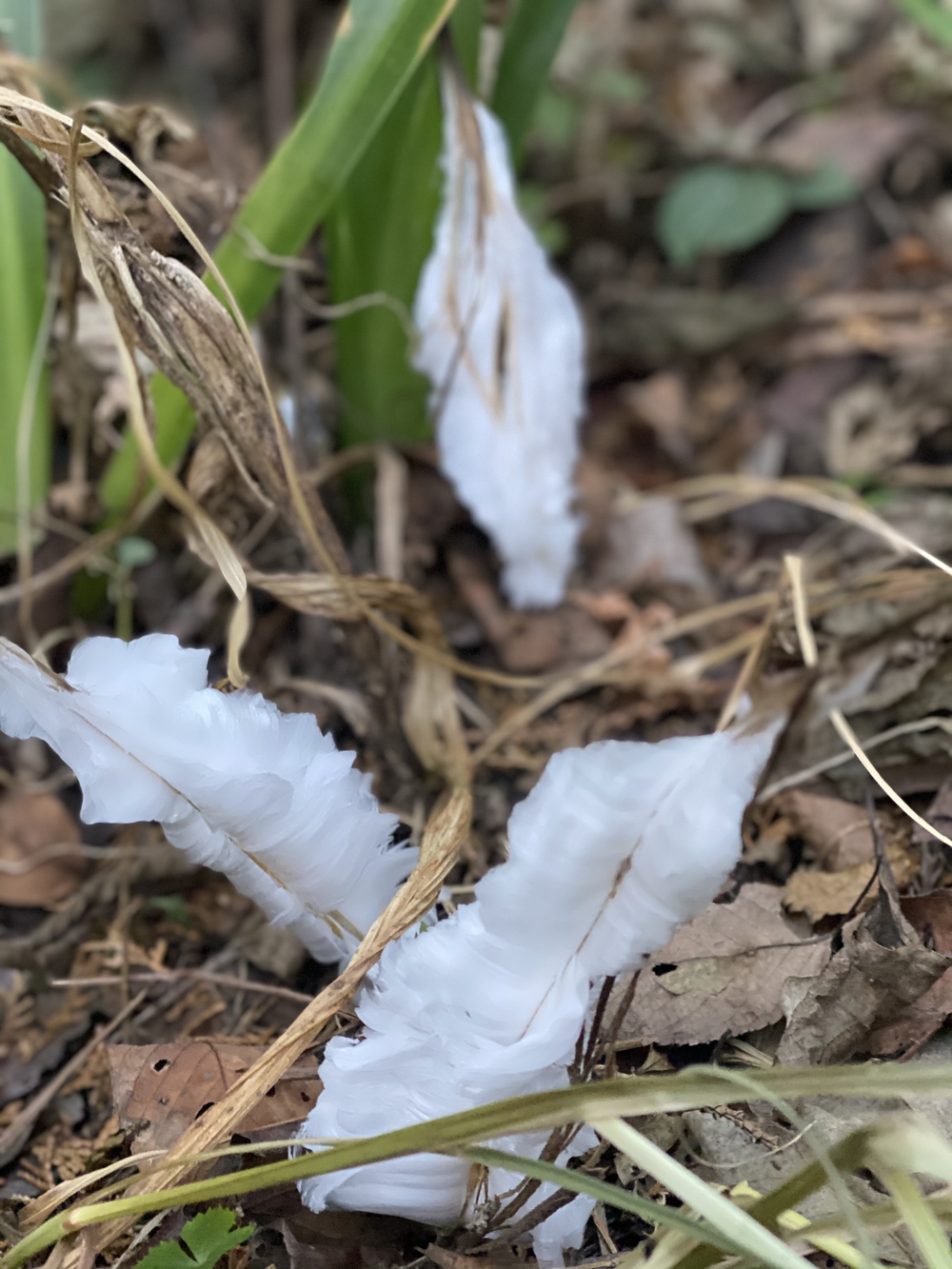 稲荷山を駆け上がり、山頂を少し過ぎたところにシモバシラスポット。