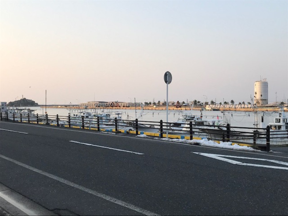 賀露大橋から鳥取港(賀露港)を臨む旅館街、カニ料亭街を横目に海沿いを走り抜けます。かろいちからはアップダウンのある県道鳥取空港賀露線(かにっこ空港ロード)が始まります。ここは2018年に完成したので歩道も綺麗で走りやすいです。