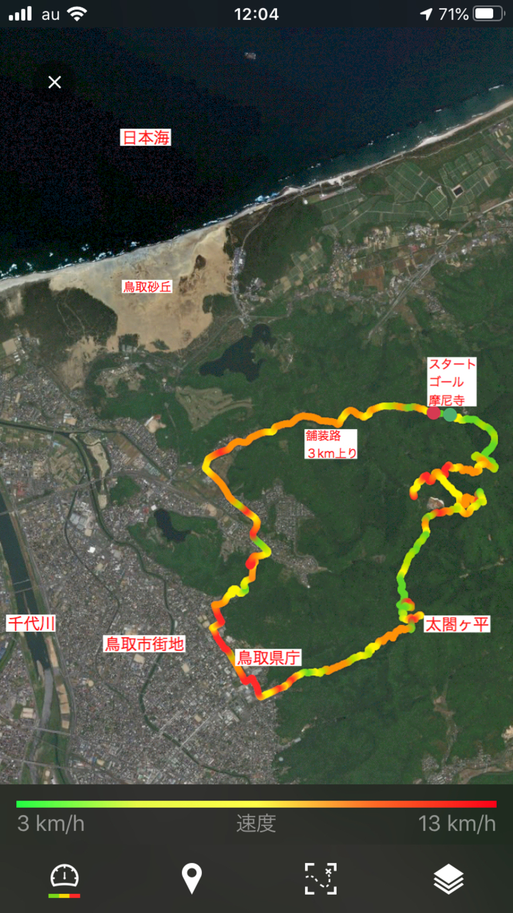 摩尼寺(まにじ)~中国自然歩道~太閤ヶ平(たいこうがなる)~山道下山道~鳥取県庁~鳥取城跡~鳥取市北園町住宅街~3km上り~摩尼寺
