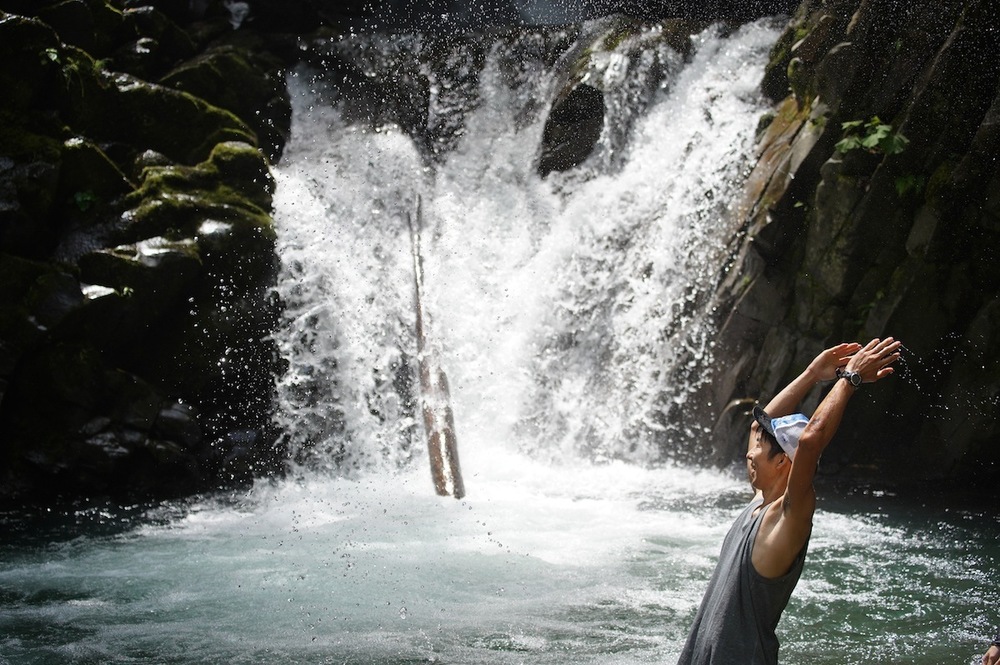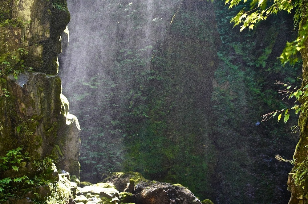 道中は適宜、休憩を挟みながら、大休峠をピークにして落差42m、日本の滝100選に選ばれた名瀑の大山滝まで下っていく。夏休みのドボンに最適のコース。大休峠から大山滝までにある林道が美しく神秘的。