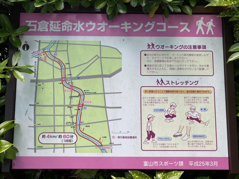 いたち川沿いの「石倉延命水ウォーキングコース」(約4km)と松川公園ウォーキングコース(約2km)をつなぐコースで、コース上には多数の地蔵や彫刻などの作品もあり、数多くかかる橋にも風情のある名前や言い伝えが残っており、じっくり堪能できる素敵なコースです。沿道には可愛い花がたくさん。桜の季節は両岸の桜が圧巻です。(写真はごく一部です)