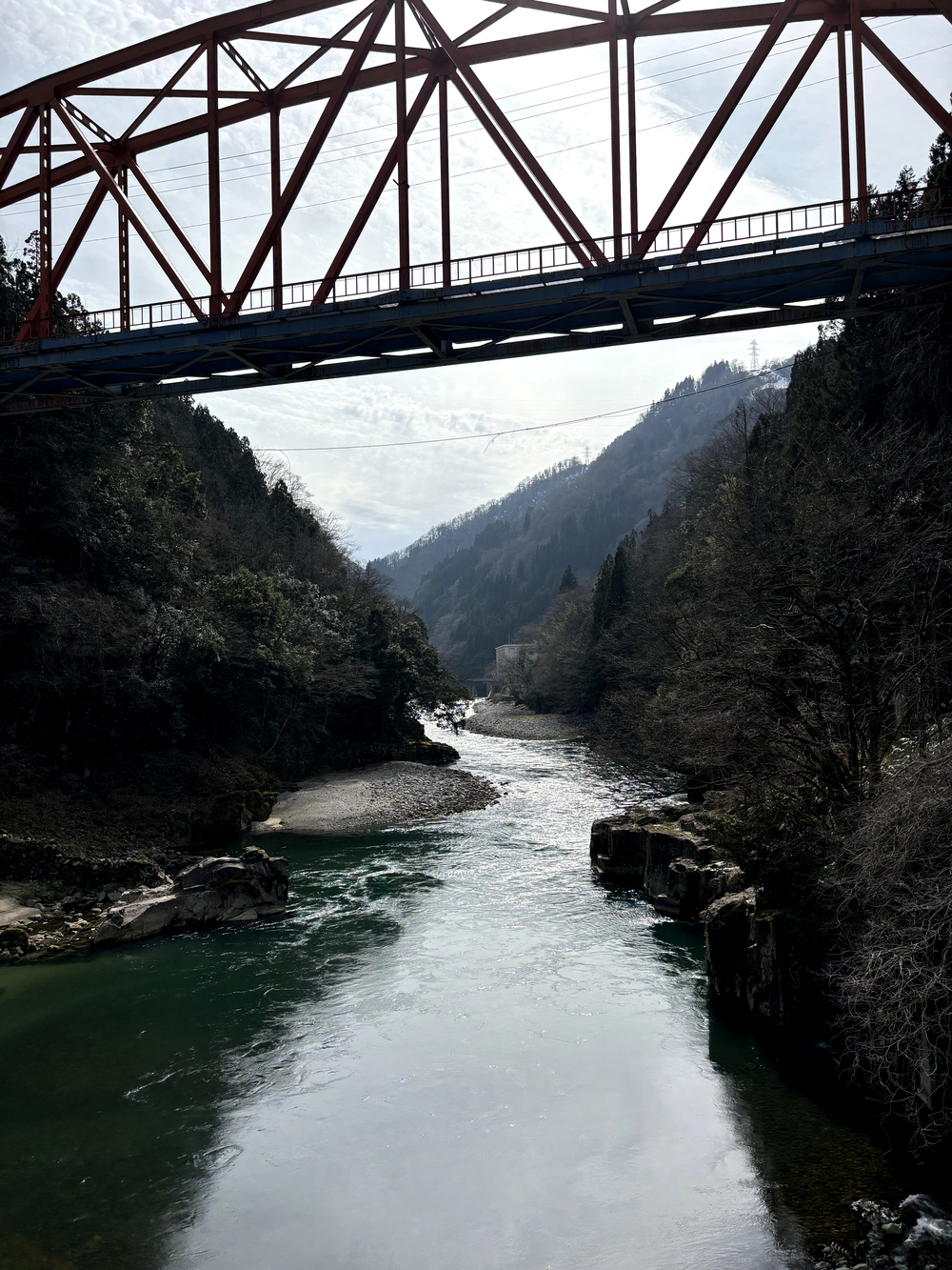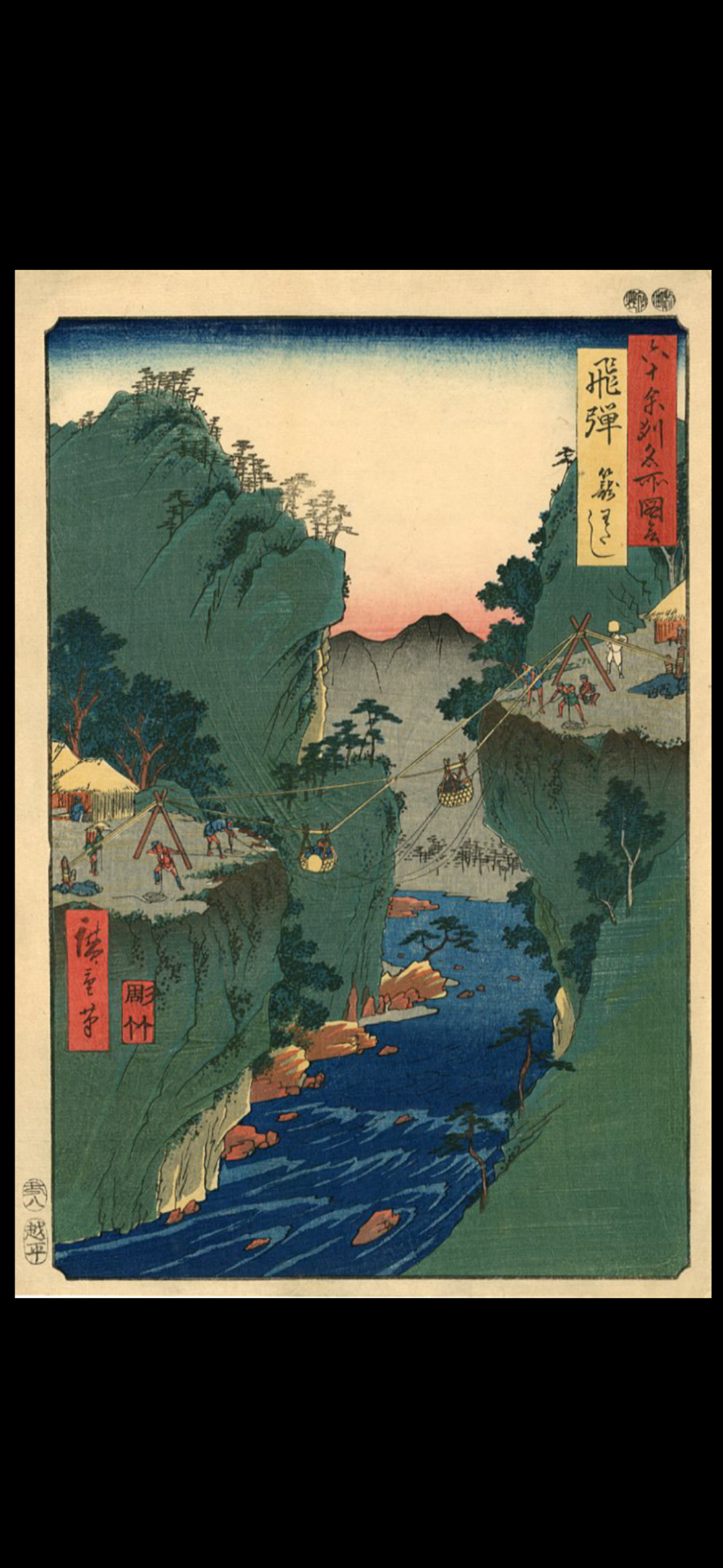 広重の「飛弾籠わたし」を巡ります。飛騨地方は、山深く、架橋の設置が難しく、渓谷の間に網を渡し宙吊りにした籠を引いて移動させる「籠渡し」が行われていました。猪谷駅前の案内所には当時の資料が多く残されており、籠の実体験も出来ます。この一帯は今でも野生の熊が多く生息していて、冬以外は注意が必要です。