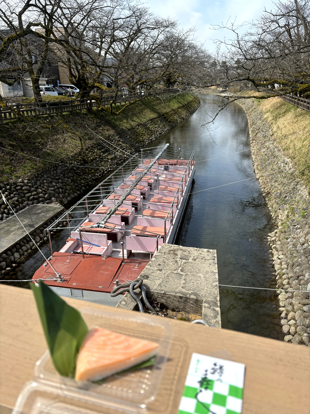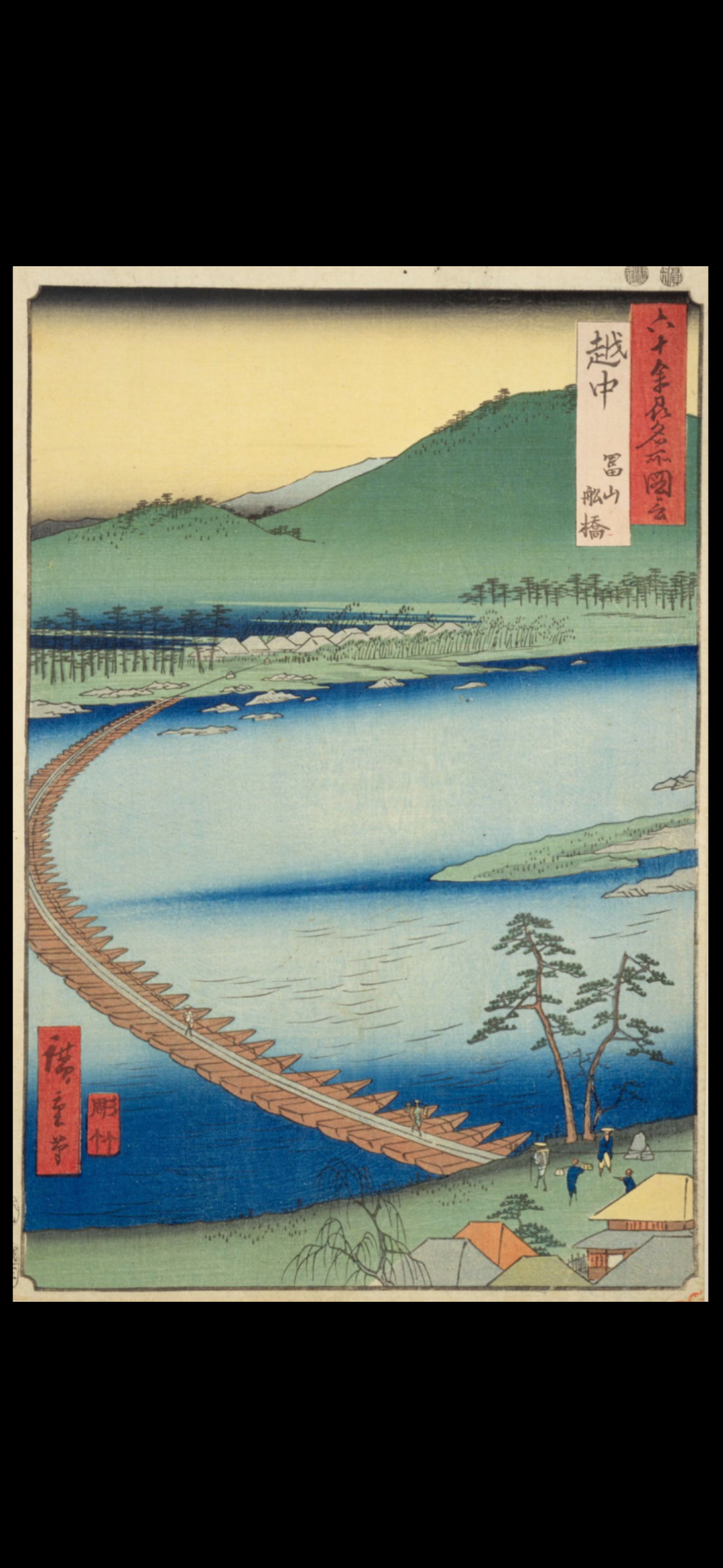広重の「越中 冨山 船橋」を巡ります。奥飛騨から富山湾へ流れる神通川は流れが早く、船渡しが困難だった事から数十隻の船を繋いで橋を造ったそうです。明治に入り大規模な改修工事により神通川本流が西に移り旧川は小規模に埋め立てられましたので両方の川を記録に残しました。広重の絵の中にもある鱒は当時から名物で、今でも多くの鱒の寿司屋が存在しています。