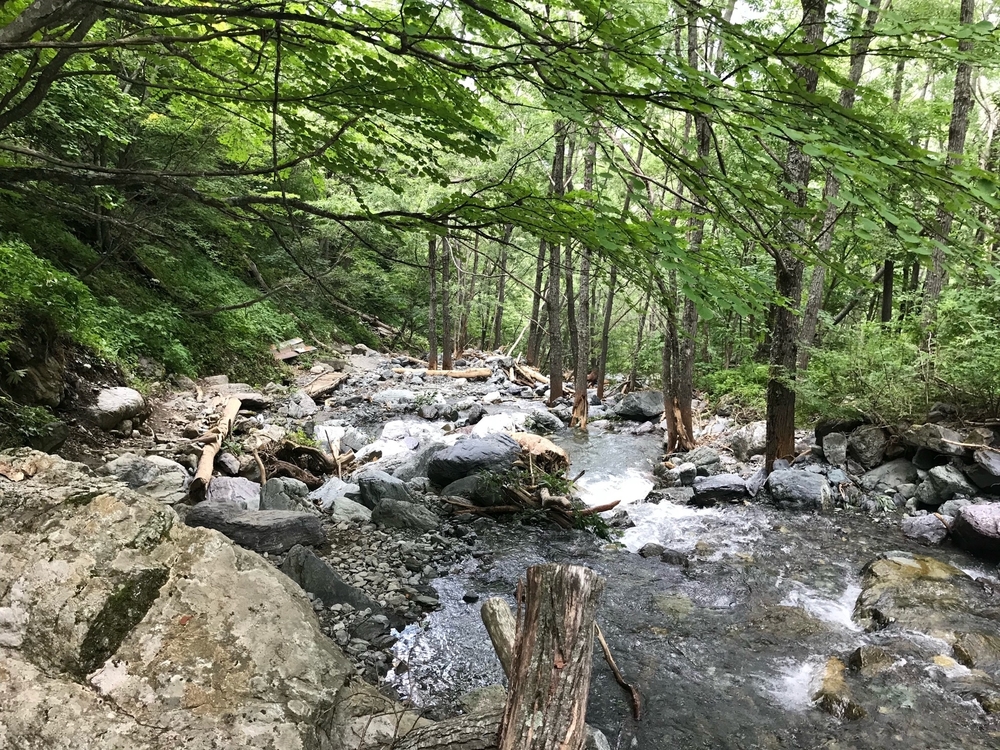 沢沿いに降りて行きます。ペンキとテープがしっかり貼ってあるのでコースを迷うことはありません。沢を渡ったり、コース上に水が流れているので、濡れても気にしないか、防水装備のどちらかが必要になります。靴底が濡れた状態になるので、滑りやすくなるリスクがあります。