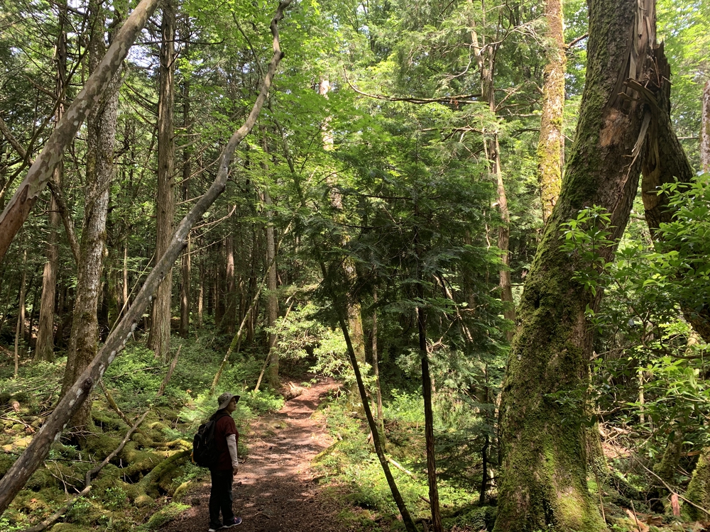 雨上がりの快晴の日に走りました。キラキラ光る苔(コケ)と、ヒンヤリとした天然クーラーの効いた樹海は神秘的でした。