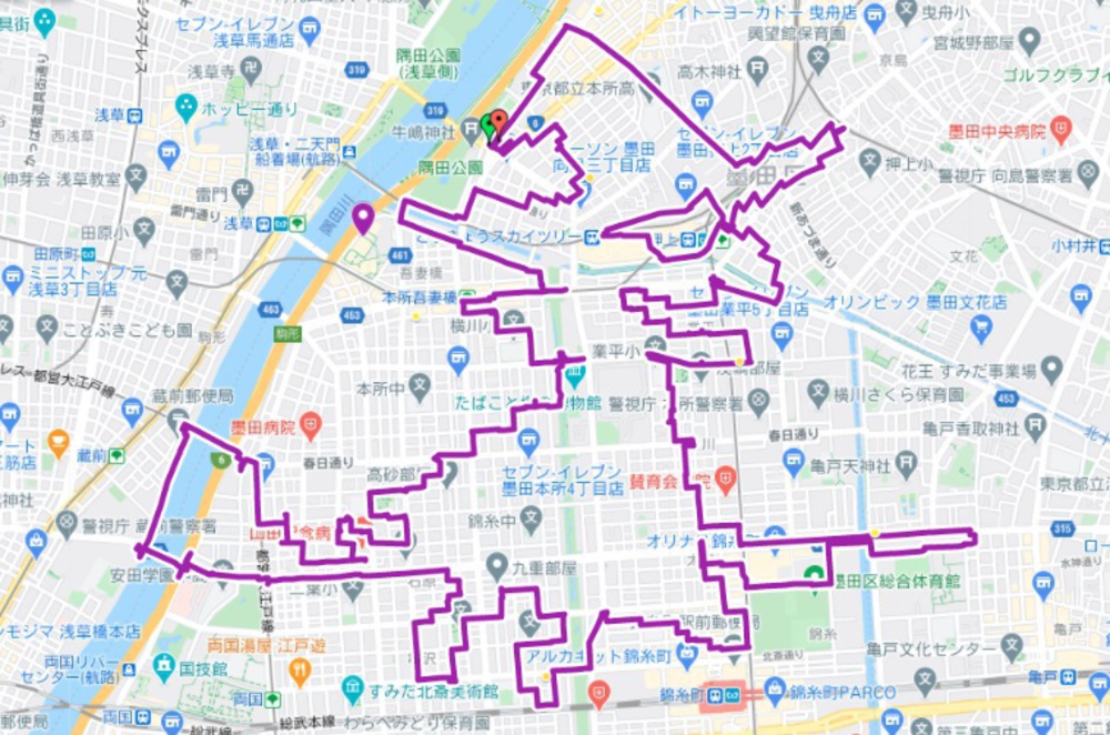 ハロウィンの前週に浅草近くのランステを利用し、観光ラン(浅草、隅田川テラス、大横川親水公園、横網町公園、東京スカイツリー)美味しいスイーツが食べられるランがしたくてコース設計。わかりやすいお絵描きと観光ラン、スイーツラン出来るようにコース設計を心掛けています。スイーツカロリーオーバー注意(笑)