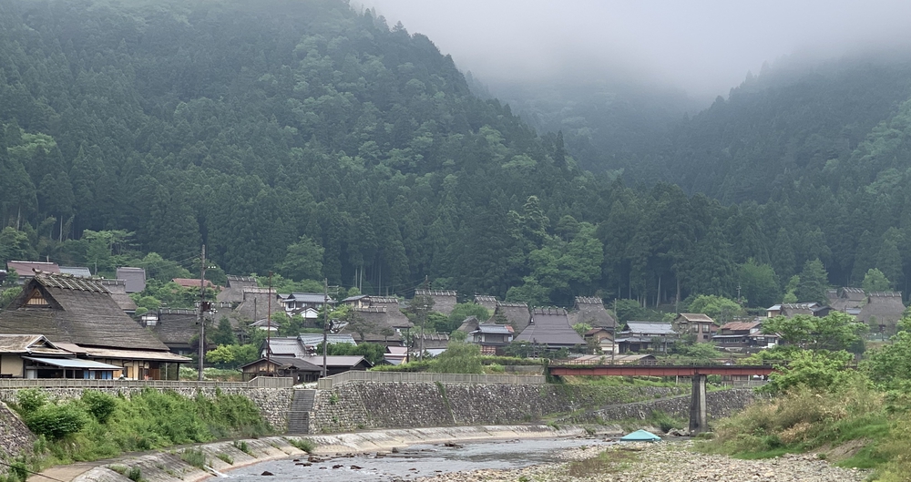 美山のキャンプ場を起点として木造校舎の小学校や渓谷美を見ながら由良川沿いを走ります。 目的地の茅葺の里は山の斜面にたつ茅葺民家の間を走ります。 出来れば観光客の少ない早朝がおススメです。 早朝でも茅葺民家の人たちが農作業しながら挨拶してくれました。