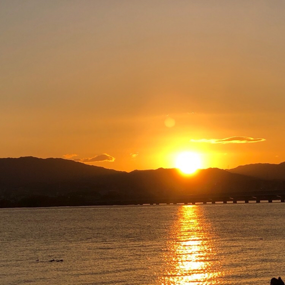 琵琶湖湖岸から近江大橋をバックに。初日の出。