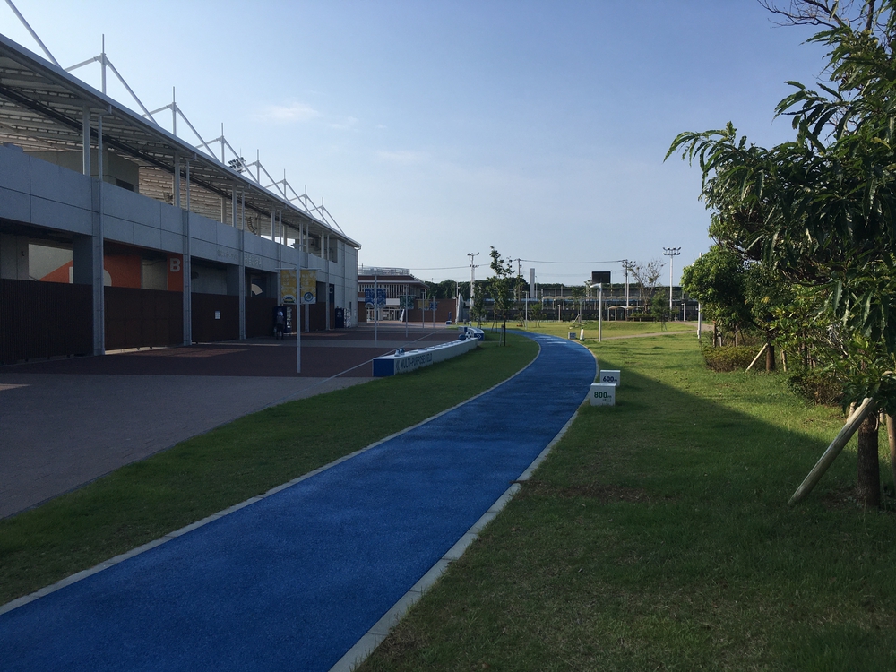 膝の調子悪く、地元平塚周辺で膝に優しいコースはと探索した所、お隣にオールゴムチップ舗装のコースがありました。6周で5kmの設計と思われます。車で行きましたが、200円/時間の駐車料金とシャワー100円です(シャワーは試してませんが)。出来てから年数も浅く、ゴムチップのクッションも良好です。