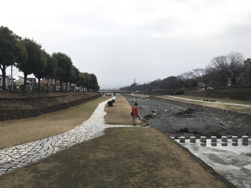 写真の様に川沿いに芝生の部分が多く、選んで足に優しく走ることができます。(万葉の湯の日帰り湯で汗を流しました)