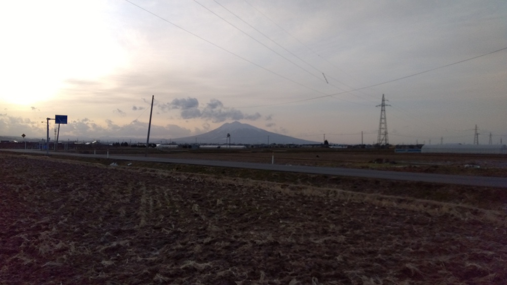 津軽平野。 長い直線コースは、晴れた日は岩木山が 一望できます。 白馬龍神温泉スタート。東奥義塾高校を過ぎると 長い直線コースに出ます。そこからは目の前に岩木山が。 途中コンビニが2件あります。 白馬龍神温泉は早朝から営業しています。