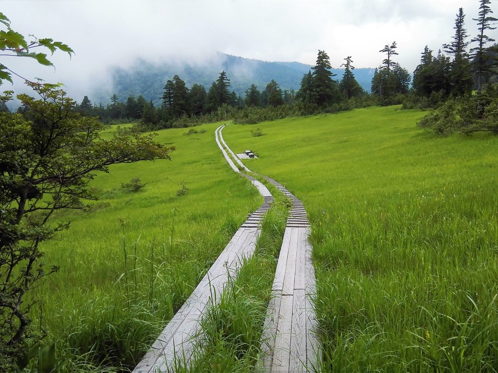 一度に尾瀬沼・尾瀬ヶ原の両方を訪れる欲張りな周回コースです。 福島県桧枝岐村から入り、御池駐車場(1回1,000円)を発着地とします。シャトルバス(夏季は4:30から約30分間隔で運行。片道運賃520円)でトレイルのスタート地点である沼山峠バス停まで行きます。 ここから沼山峠…大江湿原…尾瀬沼…沼尻…白砂峠…尾瀬ヶ原(見晴)…段吉新道…燧裏林道と走って御池駐車場に戻ります。所要時間の参考として、ゆっくり走って、登山者の方の後ろについたらスピードを合わせて一緒に歩いて、とにかく道を譲りまくって、挨拶をして話をして写真を撮って3時間10分でした。 コースには登山客の方が大勢訪れる人気箇所も含まれていますので、くれぐれもみんなが楽しめるようにシェアしたいです。今回は早朝スタートで人を避けました。木道は滑って走りにくいですが、登山道が拡がらないようにするためにも木道が設置されている場所では必ず木道上を通過するようにしてください。また、トイレはチップ制です。100円玉を必要額分準備してください。 コース上は携帯電話は使えません。セルフレスキューが基本です。幕営地もあるので、お好みの方は野営装備を使ったバリエーションコースも設定できます。その場合、三条ノ滝立ち寄りや燧ケ岳山頂通過がおすすめです。