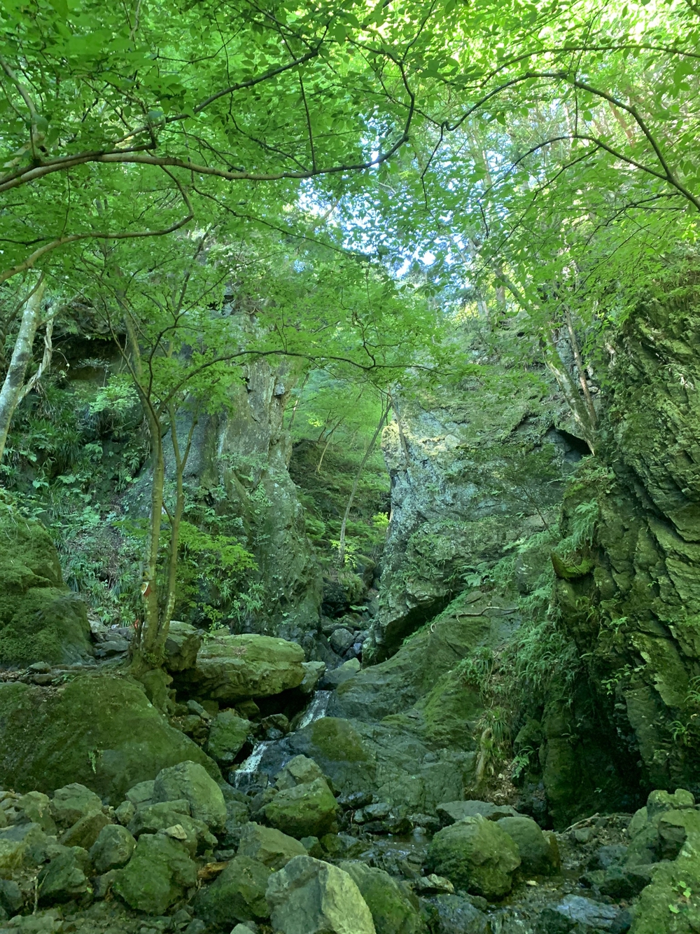 さわらびの湯バス停〜有間ダム〜名栗湖〜白谷沢登山口〜藤懸の滝〜天狗滝〜白孔雀の滝〜岩茸石〜ゴンジリ峠〜棒ノ折山〜ゴンジリ峠〜岩茸石〜平尾根登山口〜さわらびの湯 ゴルジュ:切り立った大きな岩壁に挟まれた狭い谷。フランス語でのど。 夏でも涼しい快適沢登りコース。滝はどれも、特に白孔雀は爽快。少しわけ入るだけで秘境感満載。棒ノ折山頂手前は急登。下りも急な箇所はあるので注意も基本快適なダウンストリーム。さわらびの湯で整え。バスで飯能まで戻りビール&ピザでフィニッシュ。