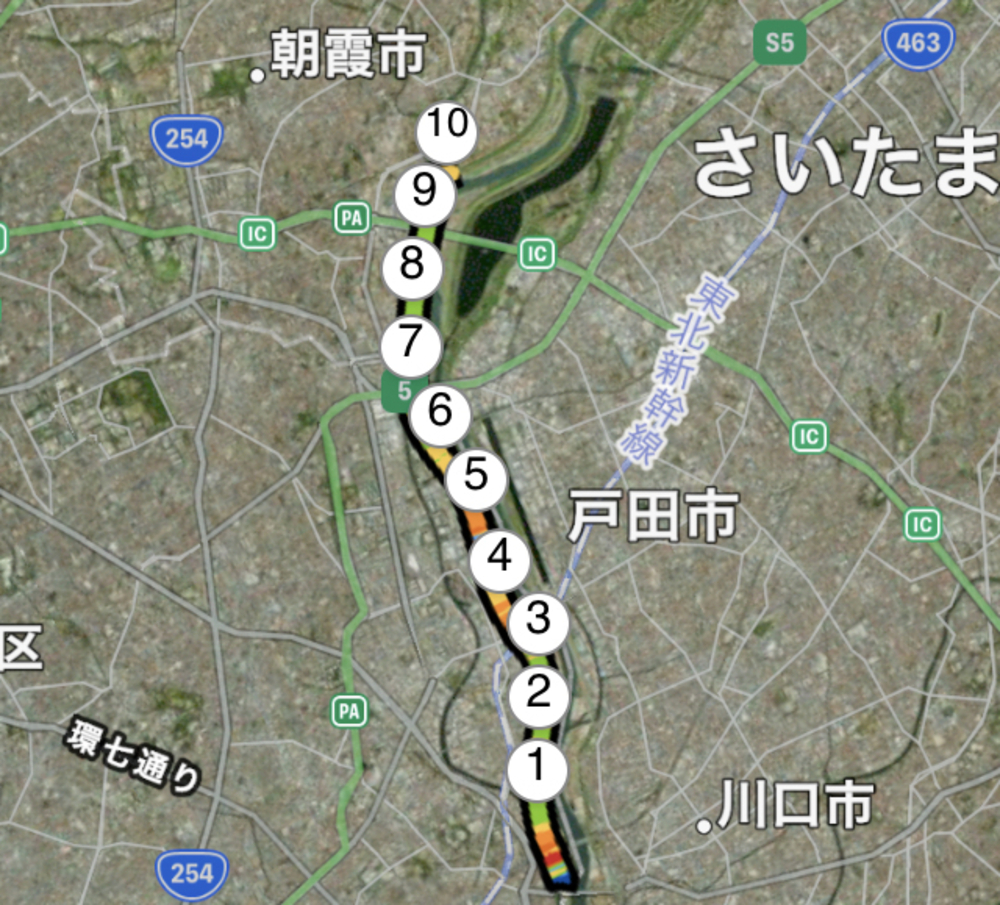荒川河川敷北区、板橋区側サイド走りやすく、安全です。 新荒川大橋から戸田橋、笹目橋、幸魂大橋超えて、朝霞水門過ぎた辺りが10kmで眺めはさいたま新都心が良く見えます。
