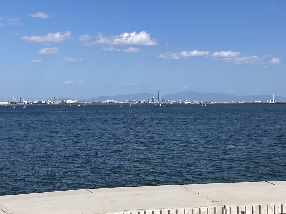 芦屋浜の総合公園と防波堤に沿って往復しました。工事完成直後で白いコンクリートが日差しで眩しい。遠く大阪湾の反対もよく見えます。