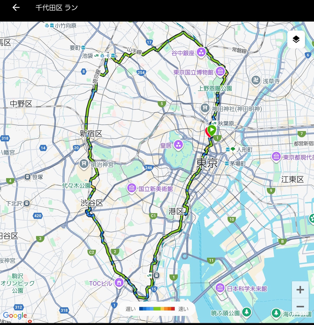 酒走ブログにも詳細を記載していますので、ご興味ある方はアクセスしてみてください。(2025/11/22投稿) https://reerac.net/blog/?p=15996 「山手線1周」って40kmくらいと思ってスタートしましたが、山手線の内側をメインに走ったこともあってか34.1km、3時間切りでゴール。ただ写真撮影時や信号待ち、コンビニでの補給などでは時計を停めているので、実際のスタートからゴールまでに要した時間は5時間20分でした。 普通に30kmとか走るのはツラいですが、テーマを決めて走るとそれなりに楽しめた感じだし、どの駅からでもスタートできる周回コースなので、「山手線1周」のロングRUNは割とオススメです。