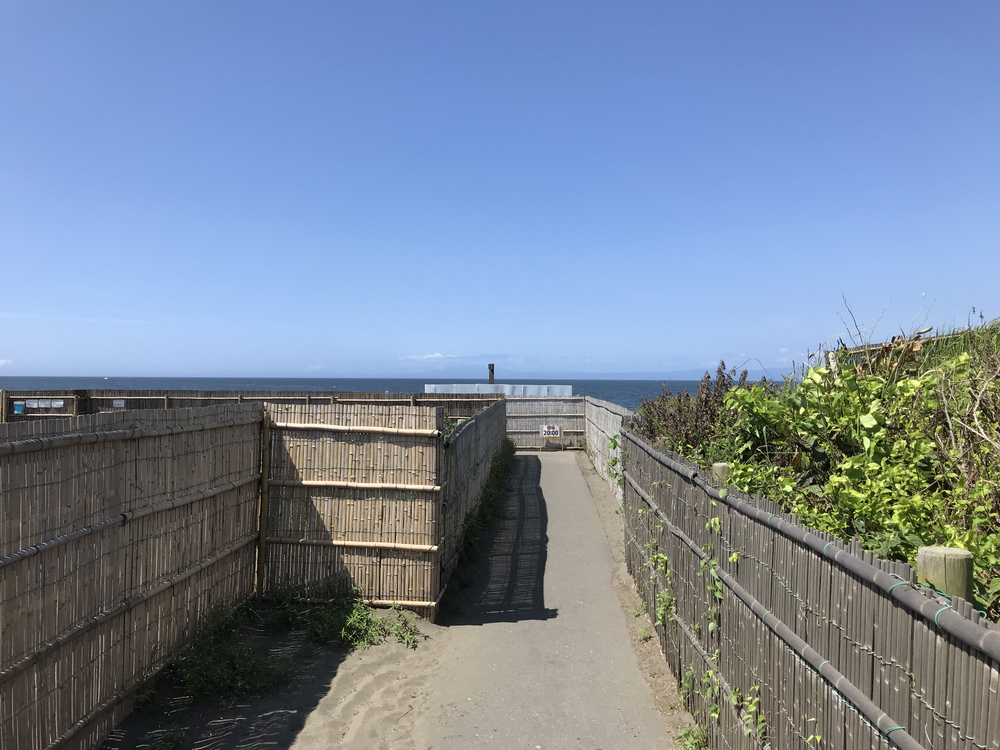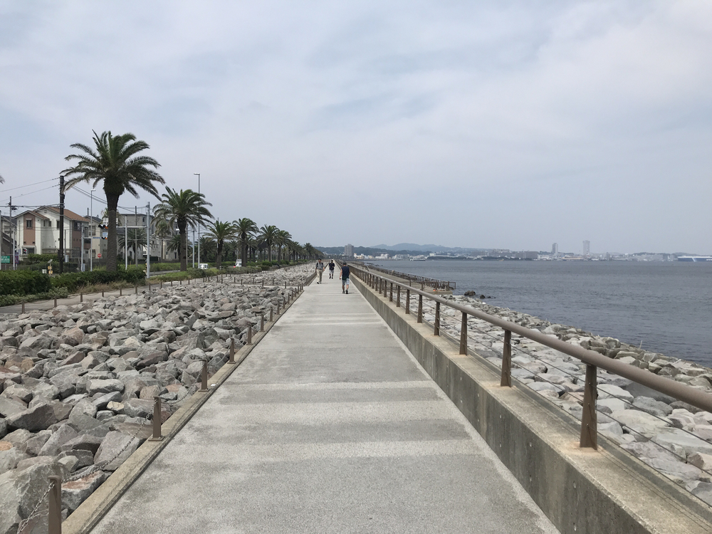 湯楽の里♨︎をSTART&GOALとした一直線 どフラットの海沿いの往復3kmのコース. 左手にはズラリ等間隔に並んだソテツが植樹 されちょっとした南国ムードを味わえる. 右前方には猿島がぽっかり浮かぶ.