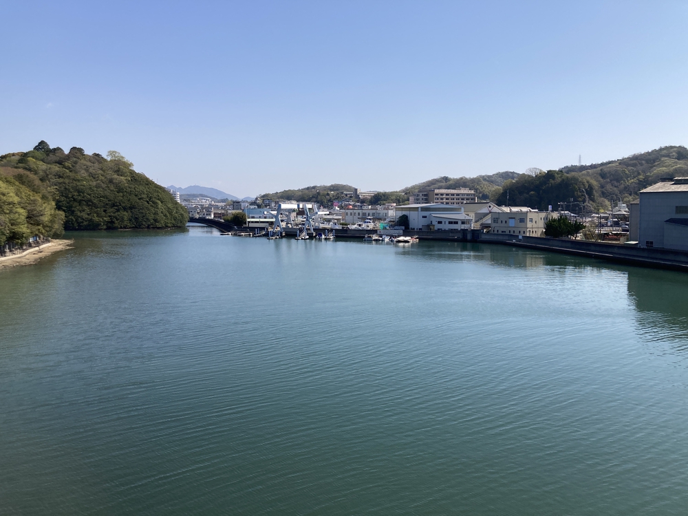 信号や車通りが少なめなルートでした。 芋谷川の右岸を基本的に進んでいきます。 新幹線の高架下を通り、国道2号線に出ます。2号線は歩道が広いですが、さらに外側に車通りの少ない小さな道路があるのでそこを進みます。 海と山の緑を気持ちよく眺めながら走れるルートでした。