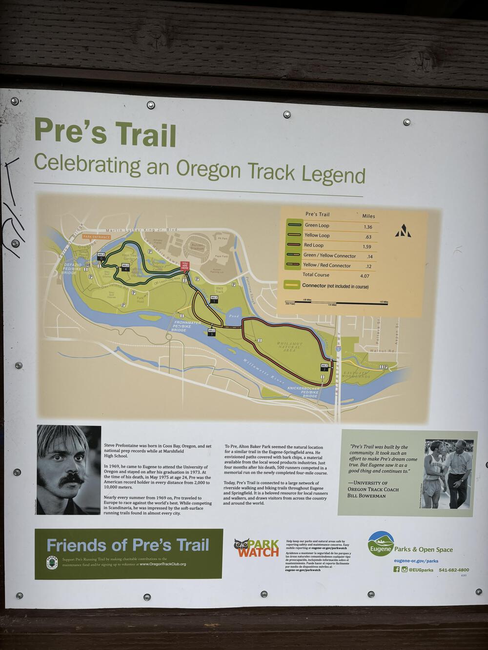 “Pre’s Trail”を経由し、ウィラメット川沿いを走るコースです。途中の”Pre’s Trail”は一周約4マイル(≒6.4km)のクロカンコースなので、周回重ねるもありです。川沿いのコースも信号は一つもないのでノンストップでサクサク走れます。ユージーンに来ることがあればぜひお勧めします。