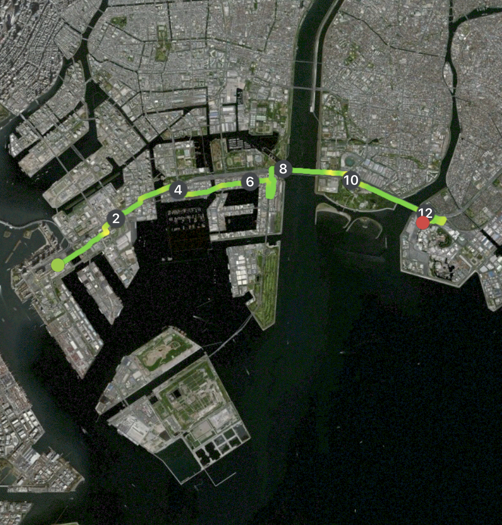 ほぼ湾岸線沿いを一直線に約10キロチョット (私は迷子でコースロスして13キロチョット😅) アップダウンもソコソコで車の排気ガスがキツいキツい所もありますが、明るいですし夜景は素晴らしく飽きません。