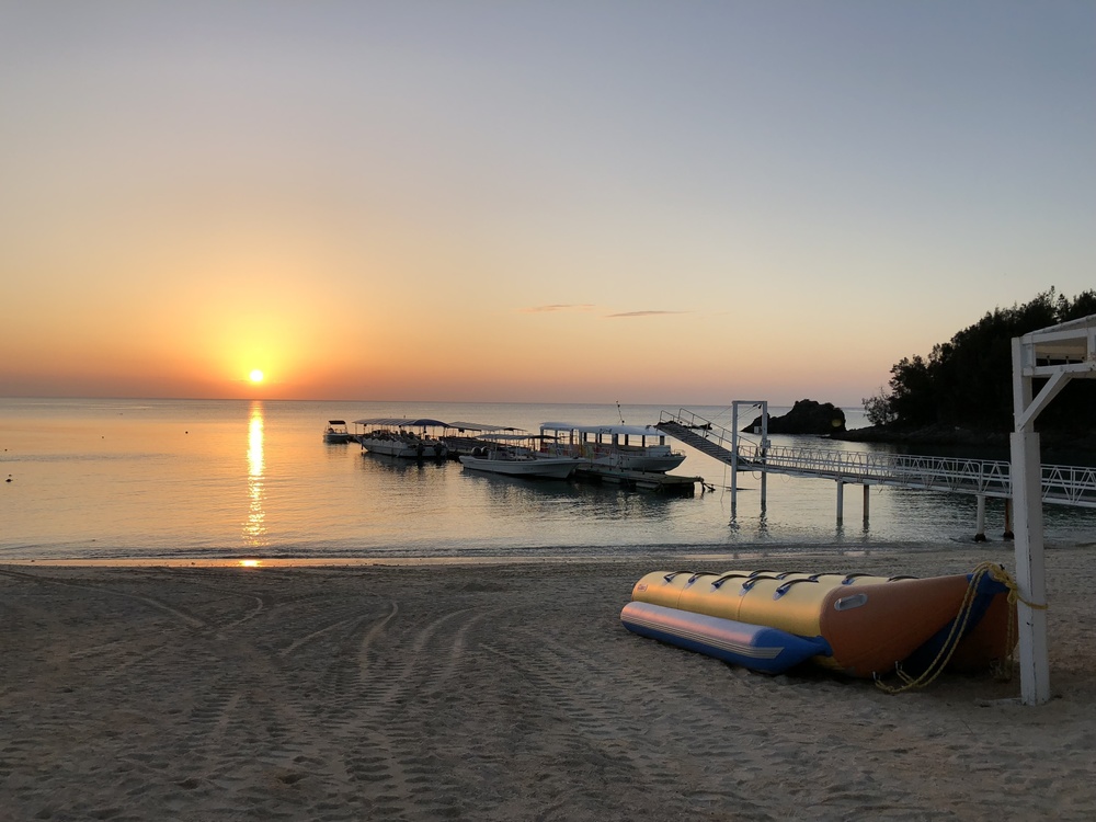 夕陽を眺めながら、のんびり気ままに1日の旅の疲れを癒すリカバリーラン! 走り終えたら、かりゆしビーチにあるコンビニで飲み物とデザートを買って綺麗な夕陽を見ながらストレッチタイム! 最高に贅沢な時間です!