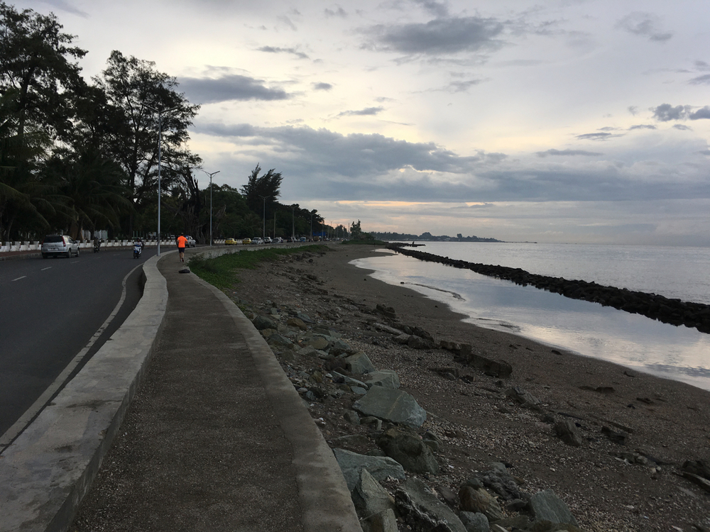 ティモールプラザからビーチ沿いの道を往復するコース。海岸に出るまでは歩道はあるけれども段差が多いので走りにくいですが、海岸沿いには歩道が整備されていて快適に走れます。大使館も立ち並んでいて景色も良いです。