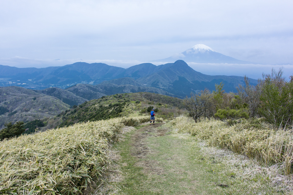 高低差は少ないのですが30km弱と距離が長いです。天候に恵まれれば終始、眺望がよく富士山に見守られての行程。神奈川、山梨、静岡の三国の県境沿いに富士山と丹沢を繋ぐ尾根を体感できます。ガーミンによる累計獲得標高は1,443 mでした。